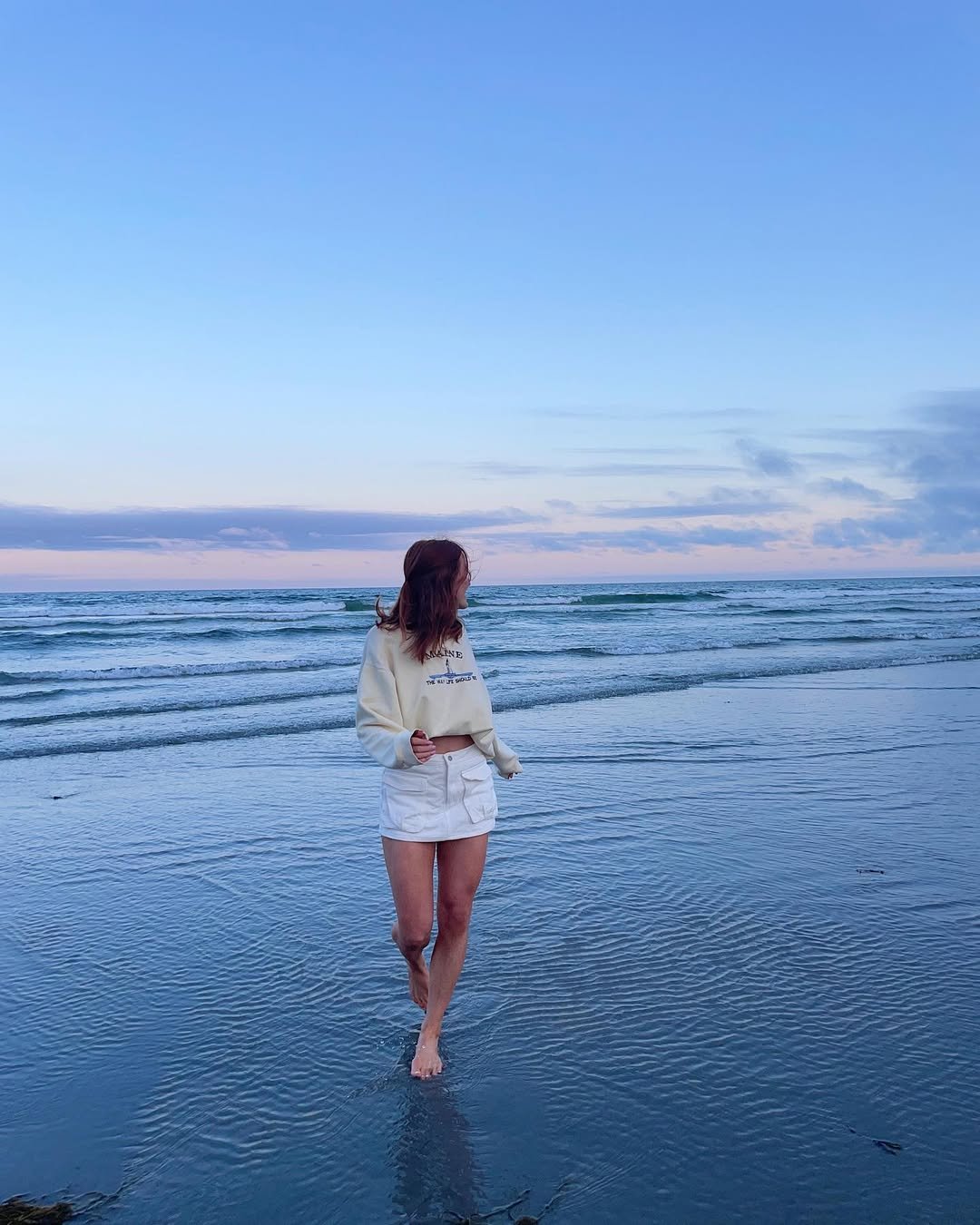A cropped sweatshirt with a mini skirt creates that effortless beachside contrast. It feels relaxed but still styled, especially with bare feet in the water.