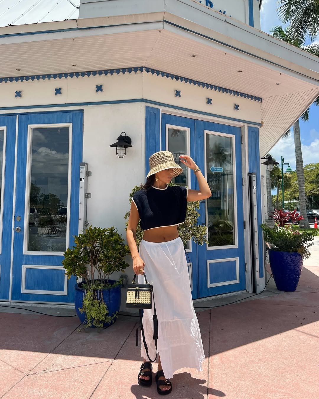 There’s something about crisp white and deep navy that instantly feels like a seaside morning. The cropped knit paired with a breezy midi skirt reads polished but still relaxed, especially with that woven hat catching the sun just right. It’s the kind of look that belongs outside a little café with blue shutters and iced coffee in hand.