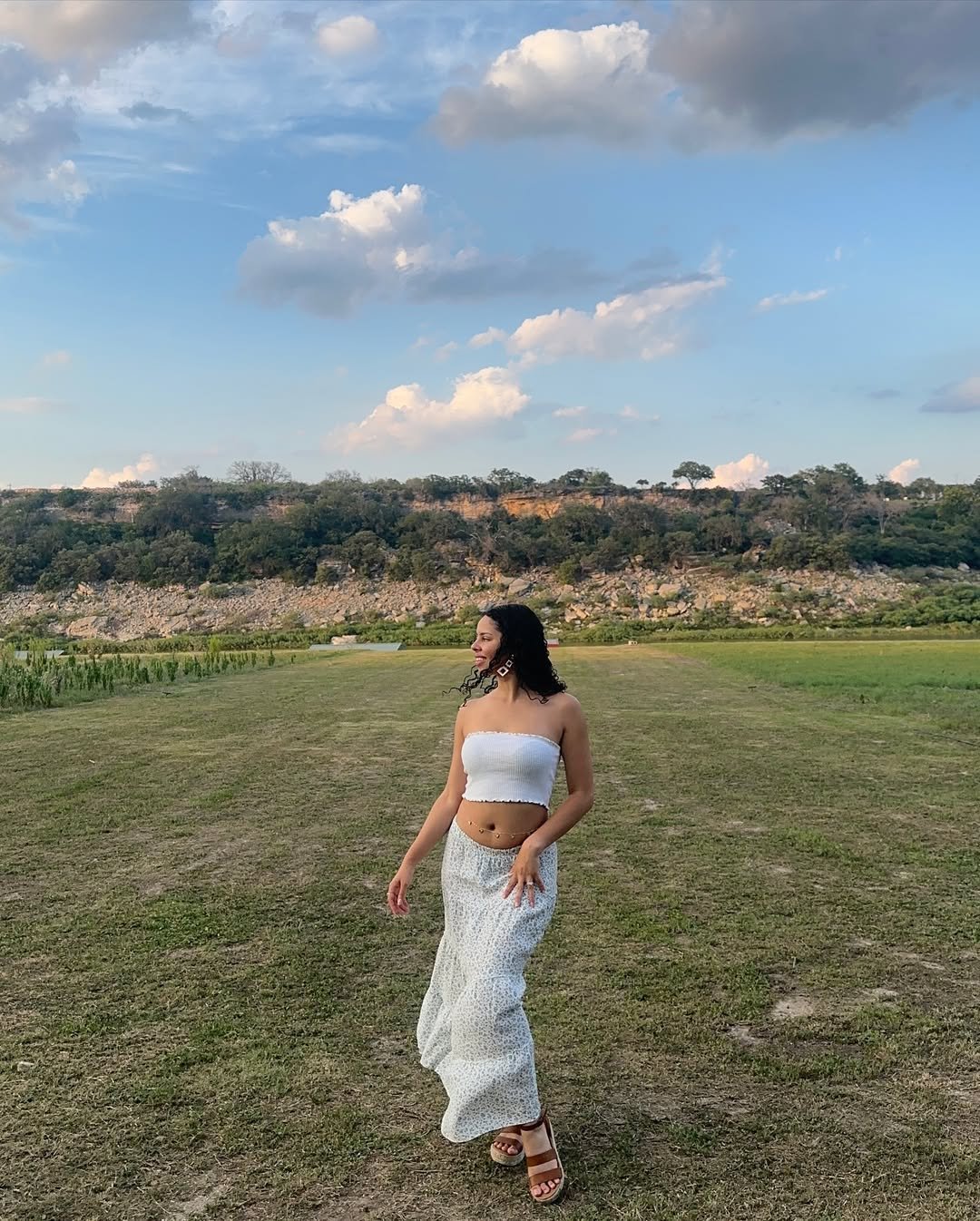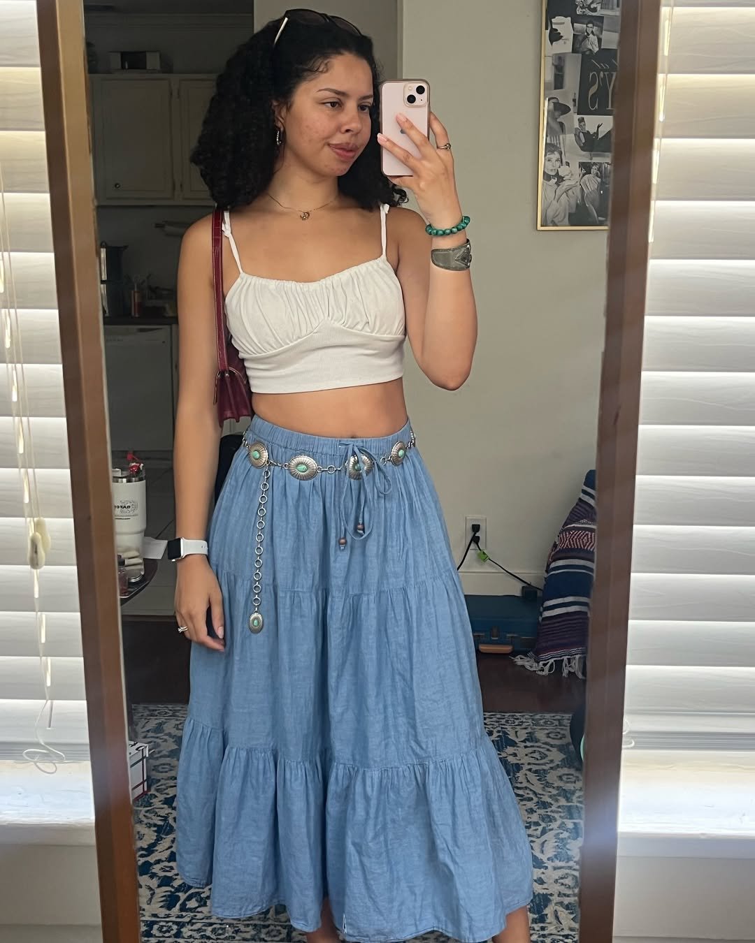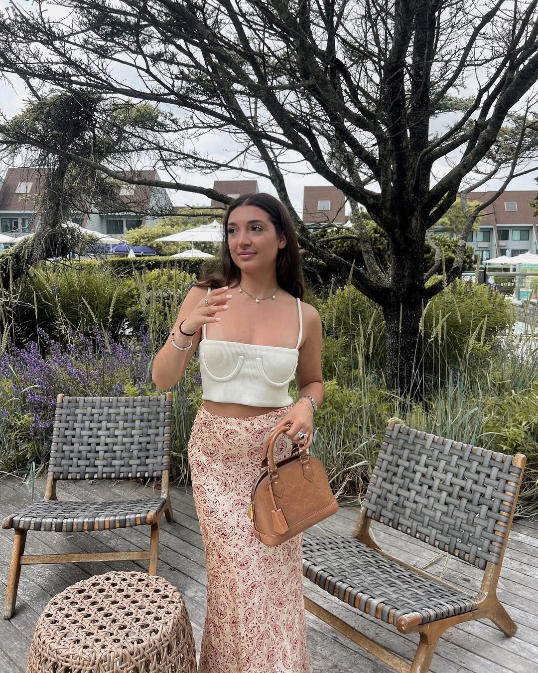 Finished with a structured bag and soft accessories, the whole look feels romantic but grounded. It’s the kind of outfit that belongs in golden hour, where everything feels a little slower and a little more beautiful.