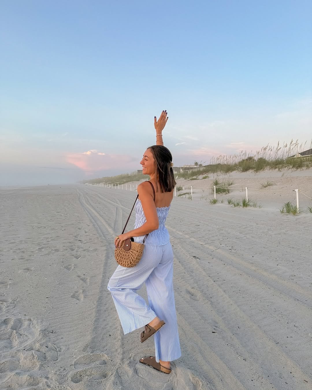 There’s something so freeing about wide-leg stripes at the beach. The movement, the soft color palette, the way it catches the breeze, it all feels like a sunset moment waiting to happen.
