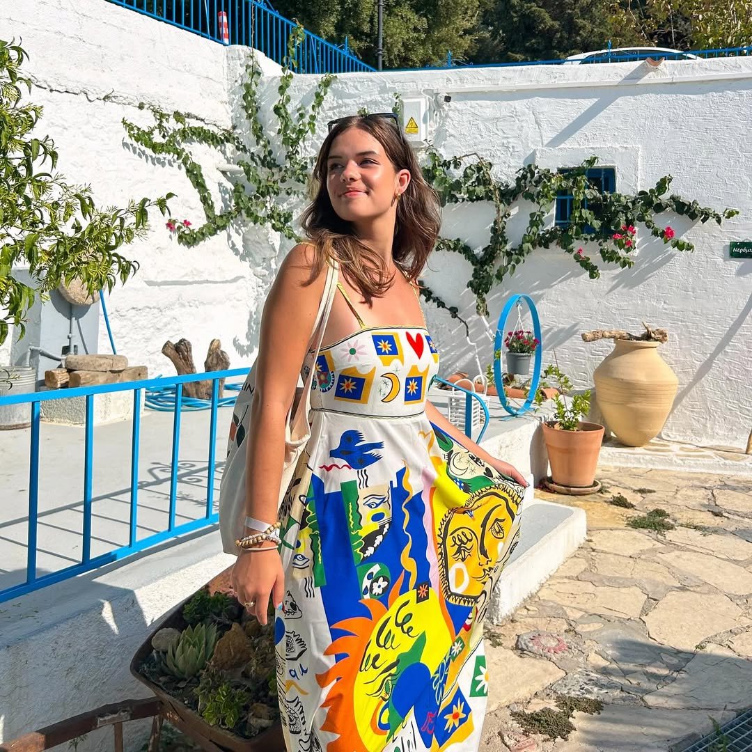 This dress feels like a walking postcard. The bold, artistic print pops against whitewashed walls and bright blue railings, creating a look that feels vibrant and full of life. It’s expressive, playful, and impossible to ignore in the best way.