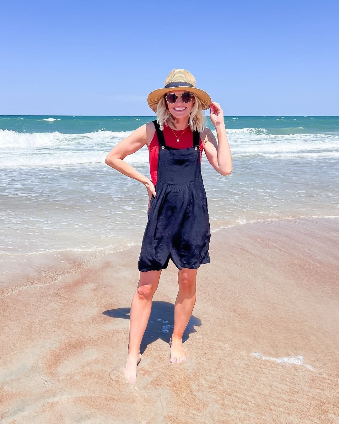 Nothing says carefree like overalls at the beach. The relaxed black silhouette layered over a bright red tank brings a playful contrast that feels fun without trying too hard. Paired with a straw hat and bare feet, it leans fully into that sun-soaked simplicity.