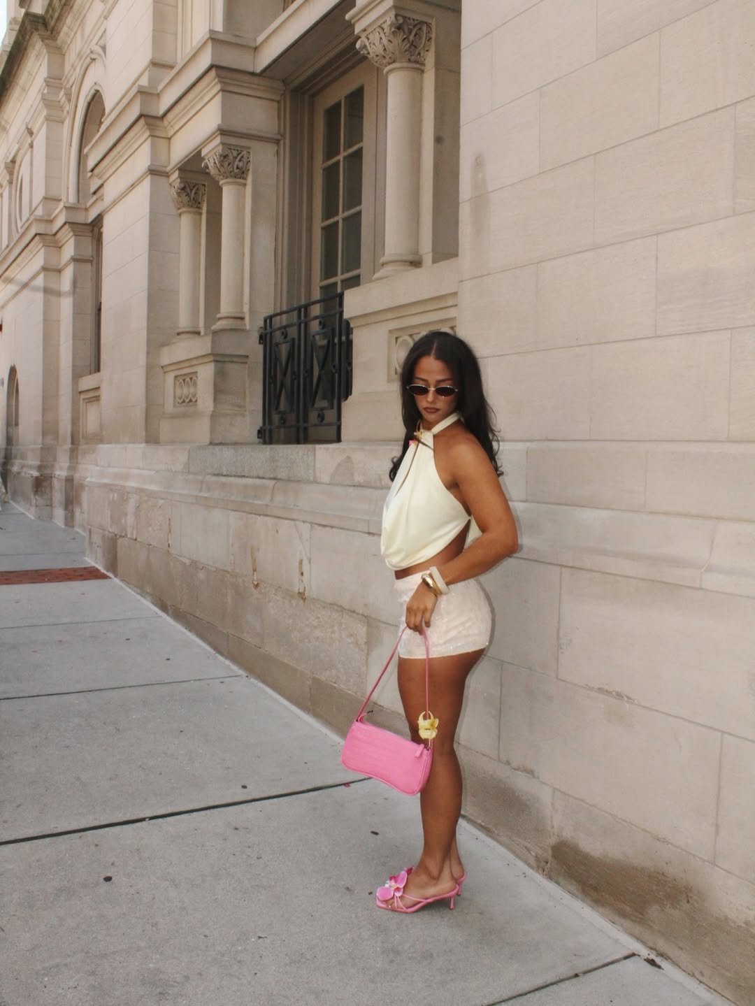 Oversized sunglasses and simple heels bring just enough structure. It’s refined, relaxed, and perfectly suited for slow afternoons by the pool that turn into dinner plans without a second thought.