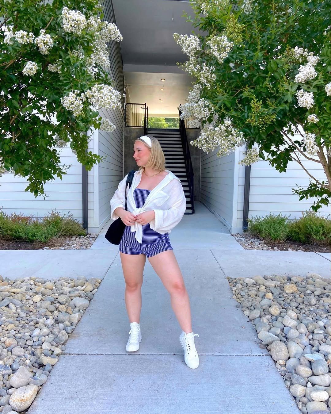There’s something refreshing about mixing sporty pieces with soft layers. The striped romper keeps things playful, while the oversized button-down adds that relaxed, borrowed-from-summer feel. Paired with sneakers, it’s ready for wherever the day goes.
