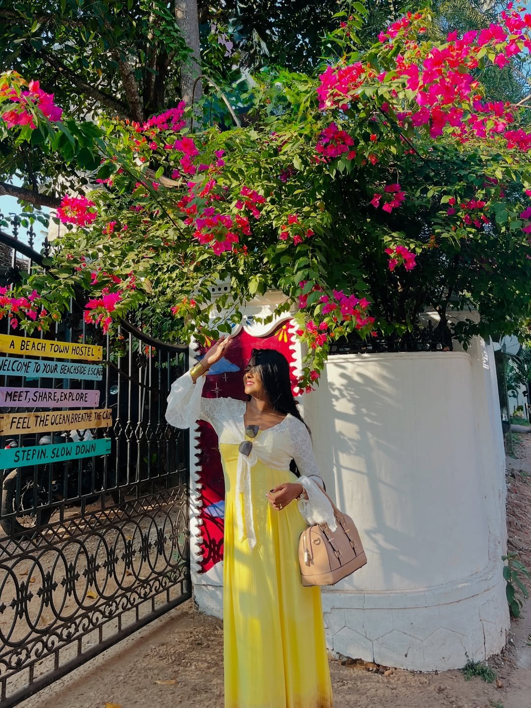 A flowing yellow dress under blooming bougainvillea feels like pure summer magic. The light fabric moves softly with every step, catching sunlight in a way that feels warm and effortless. Layered with a delicate white cover-up, it adds just enough texture without taking away from the color.