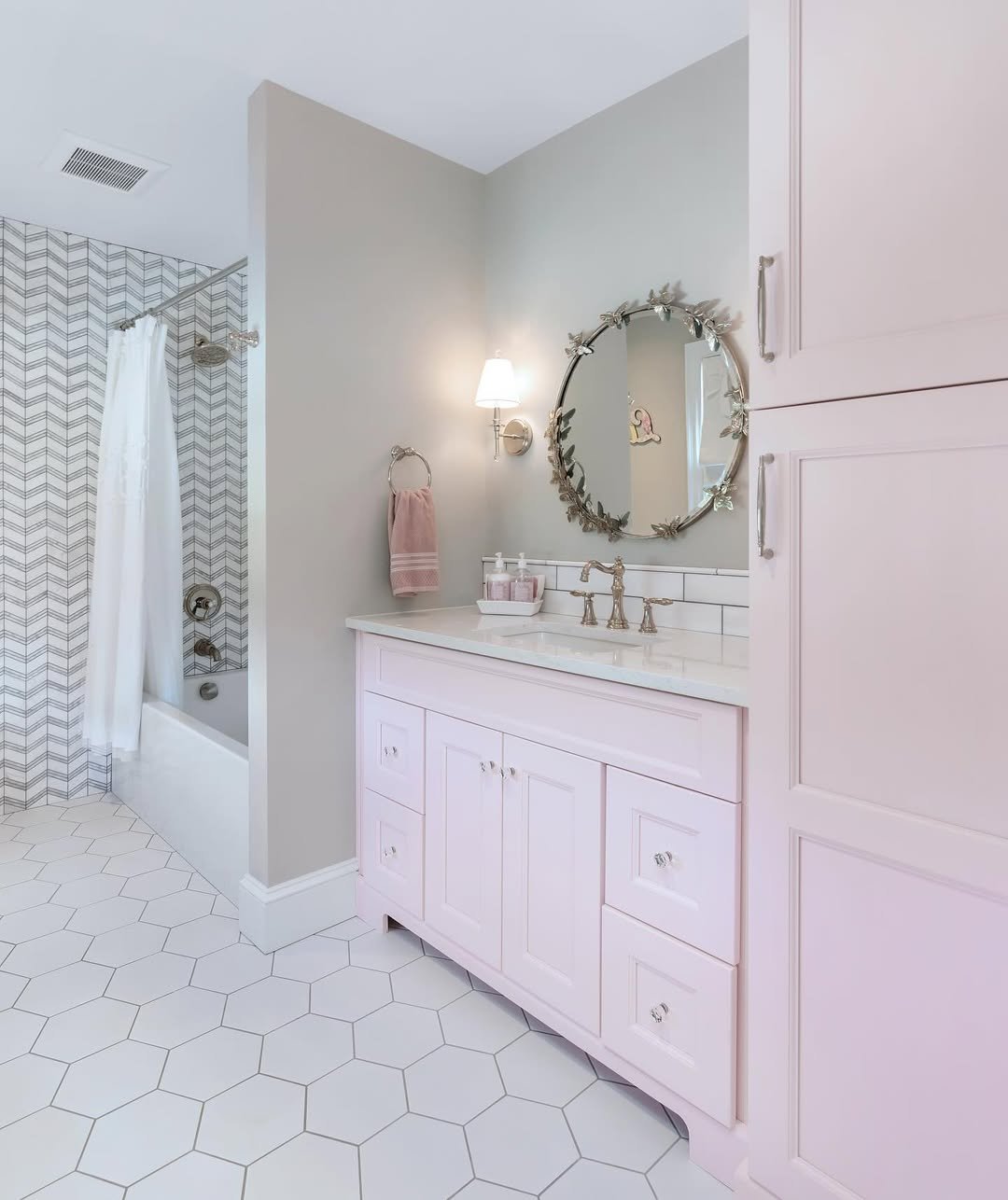This one leans into that timeless pink-and-white combo, but gives it a modern refresh. The soft cabinetry, gold fixtures, and that monogram detail on the curtain make it feel personal without being over-the-top.