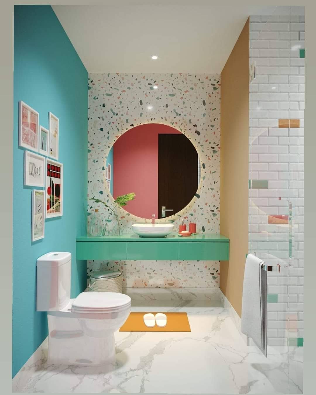 This bathroom feels like stepping into a modern art piece. The bold color blocking—turquoise, peach, and terrazzo—creates a fun, energetic vibe that kids will instantly love.