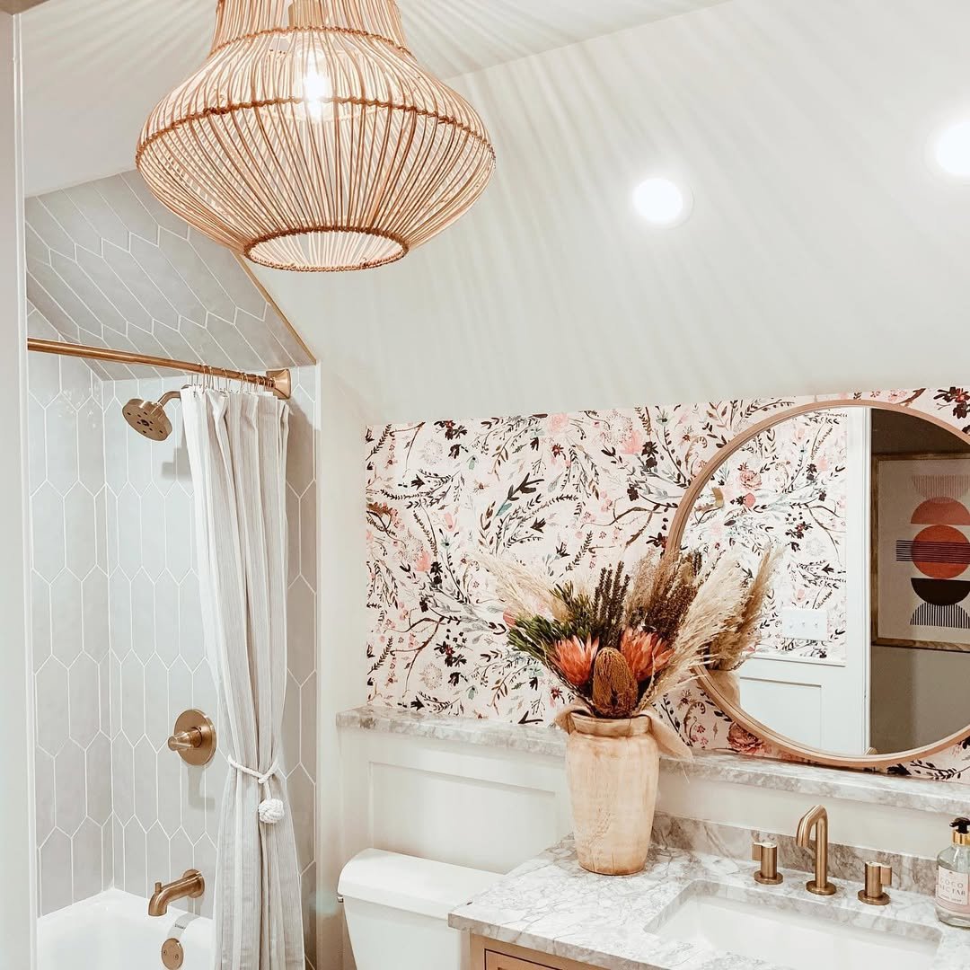 This space has that warm, tucked-away charm. The soft floral wallpaper, natural textures, and woven light fixture create a cozy, almost storybook feel that’s perfect for winding down bath time.