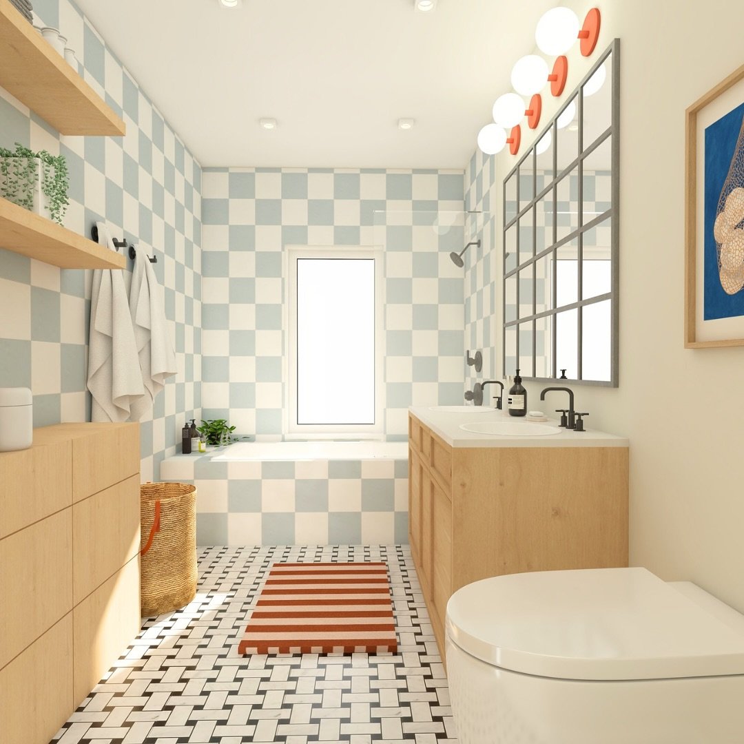 This one leans into playful geometry in the best way. The soft blue checkerboard walls paired with warm wood tones create a space that feels both fun and cozy.