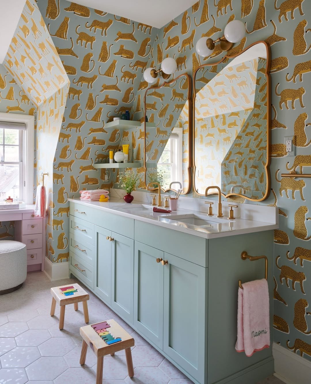 This one doesn’t hold back—and honestly, why should it? The leopard wallpaper instantly sets a playful tone, especially paired with those soft pastel cabinets and gold details.
