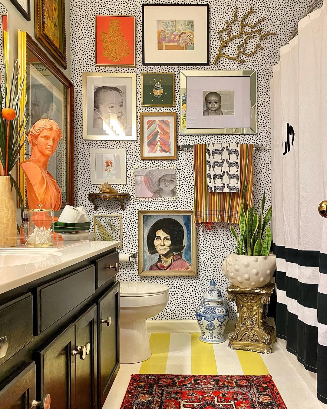 This bathroom is pure personality. From the gallery wall packed with quirky art to the dotted wallpaper and bold striped floor, every inch feels curated but still playful.
