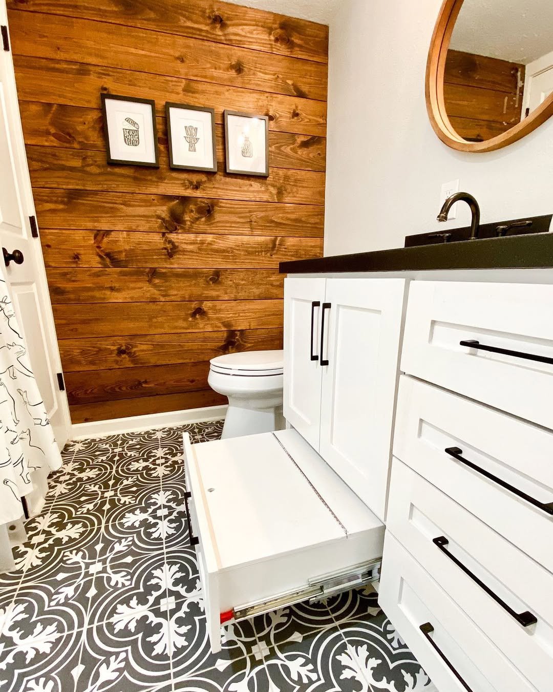 This space is all about texture and function. The wood accent wall brings warmth, while the patterned floor adds that playful edge that keeps it from feeling too serious.