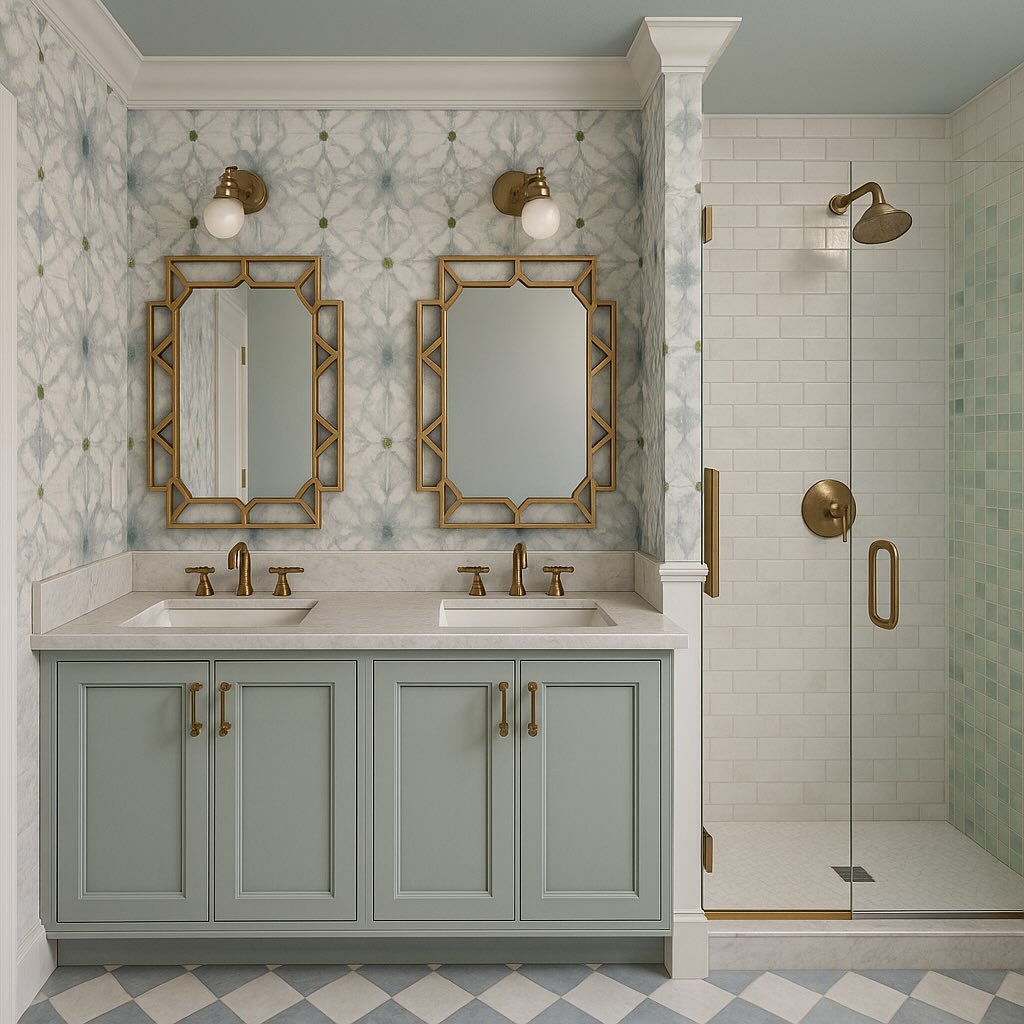 This bathroom leans into that calm, collected elegance. The sage cabinetry, brass accents, and those structured mirrors create a space that feels polished but still approachable for kids.