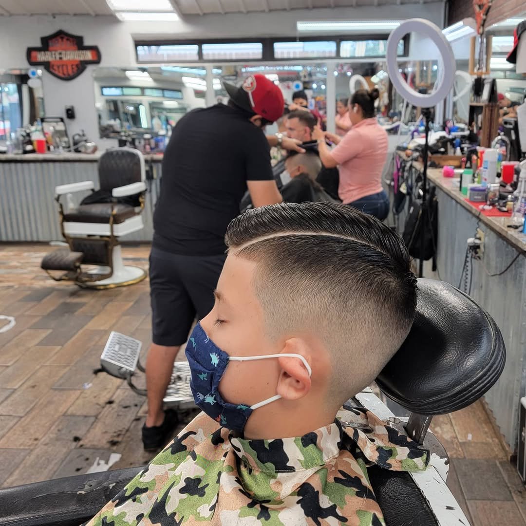 There’s something timeless about this barbershop energy—hardwood floors, big leather chairs, and a kid getting his grown-man fade with the confidence to match.