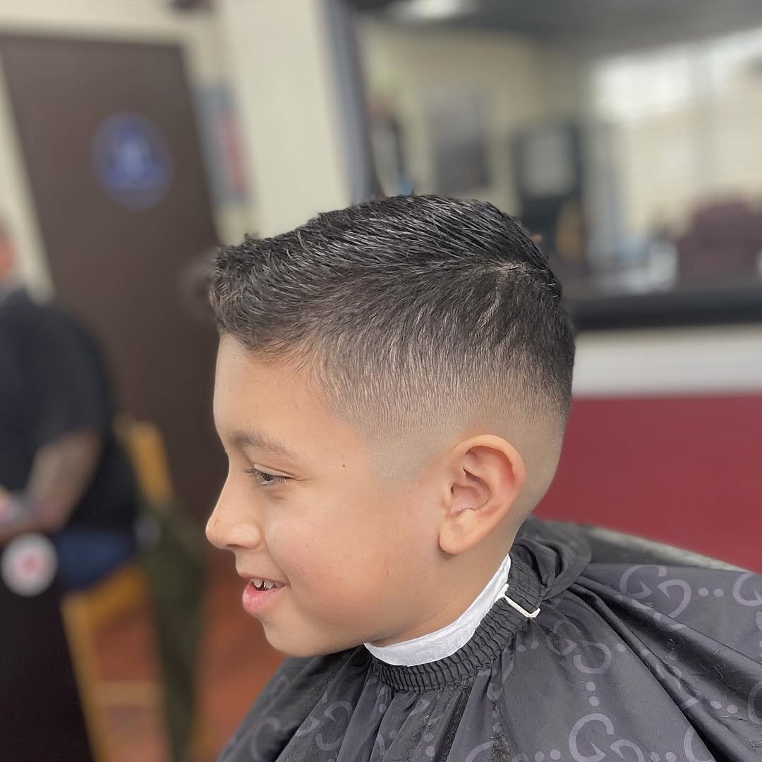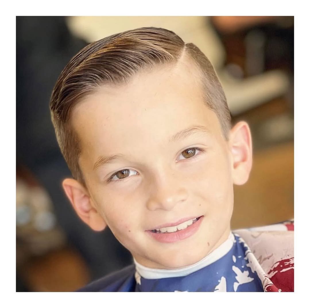 This cut feels straight out of a Ralph Lauren kids ad—tidy, timeless, and so grown-up it’ll make you do a double take. The clean side part, high-shine comb-over, and tapered edges speak to a young gentleman’s debut into dapper territory. It’s the kind of haircut that looks just as good at a family gathering as it does on a school stage.