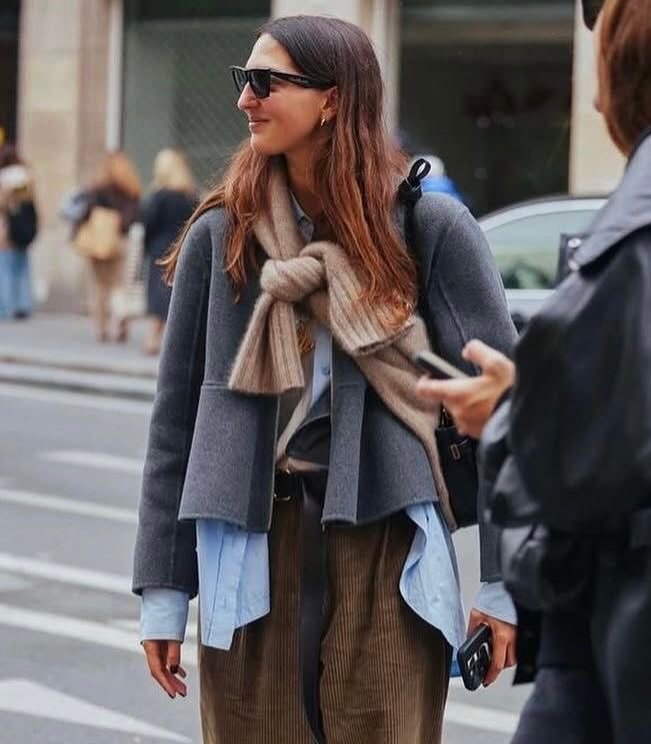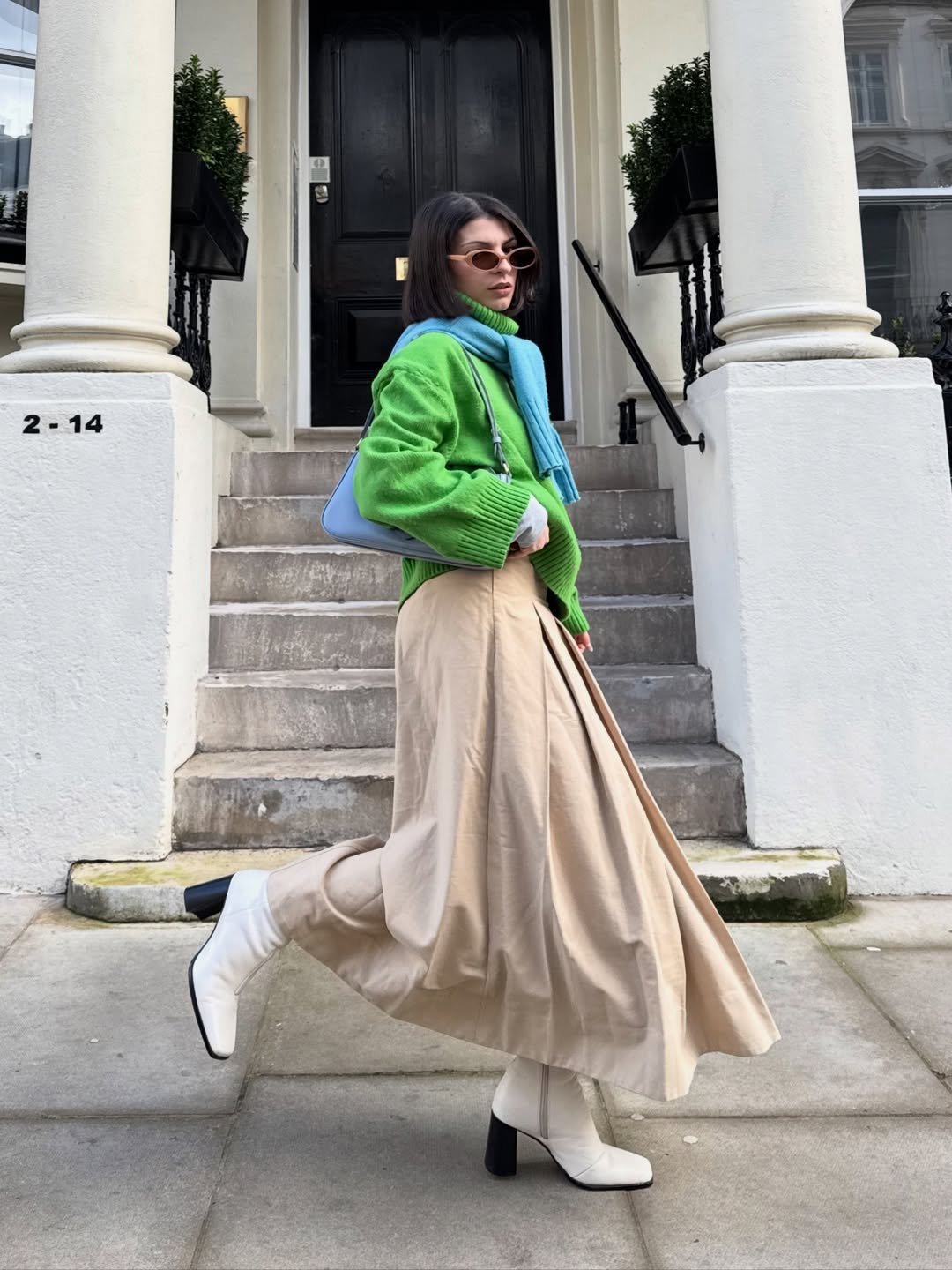 This look brings energy in the best way. The bright green knit paired with a soft blue scarf and neutral skirt creates a playful balance that feels bold but still wearable.