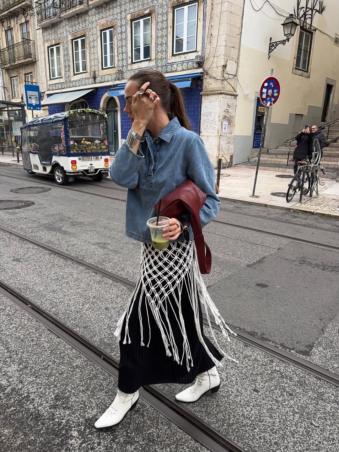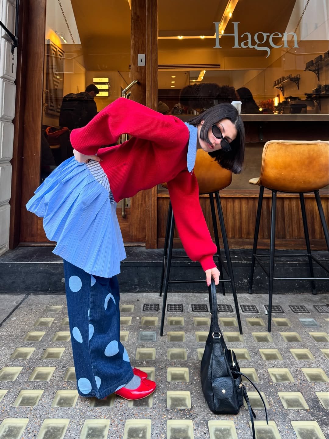 And then the details pull you in, the coffee in hand, the deep red bag tucked under the arm. It’s casual, but there’s intention in every layer, like styling that just happened to come together perfectly.