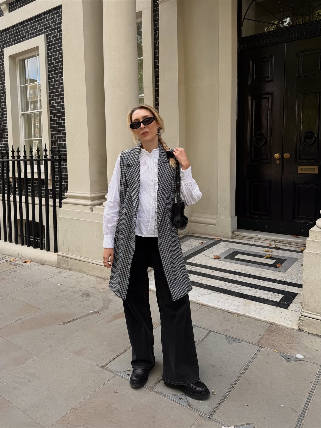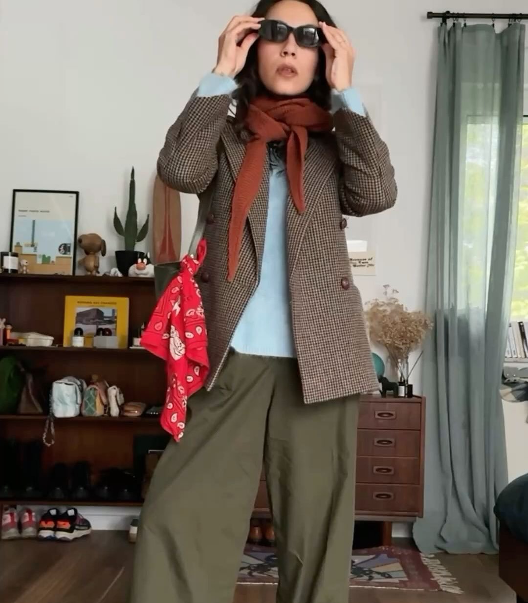 This look plays with pattern in such an easy way. The checked blazer layered over soft basics and loose trousers feels relaxed but still styled.