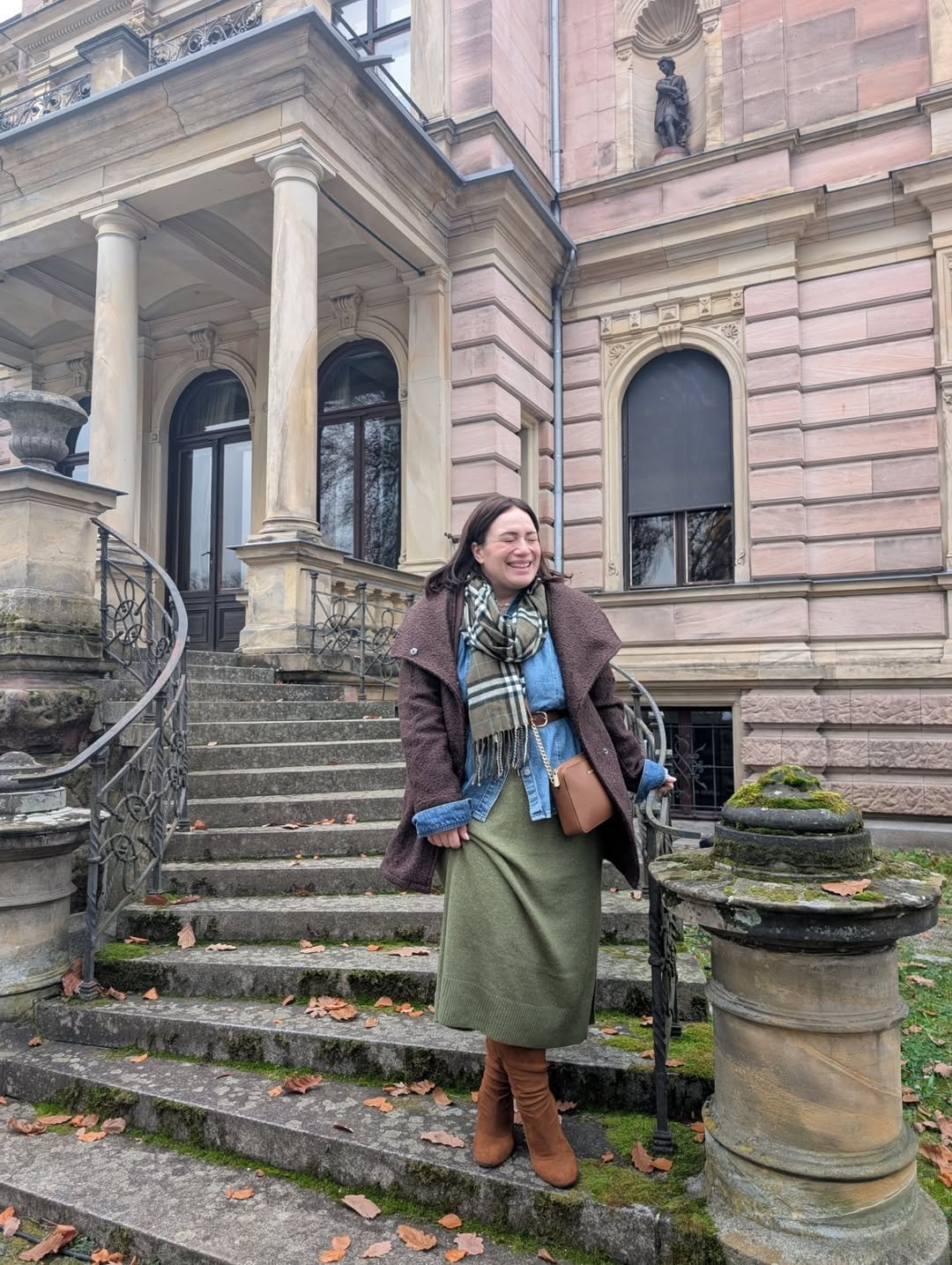 There’s a softness to this outfit that feels instantly comforting. A knit dress layered with a denim shirt, finished with a textured coat and scarf, creates that full, cozy silhouette.