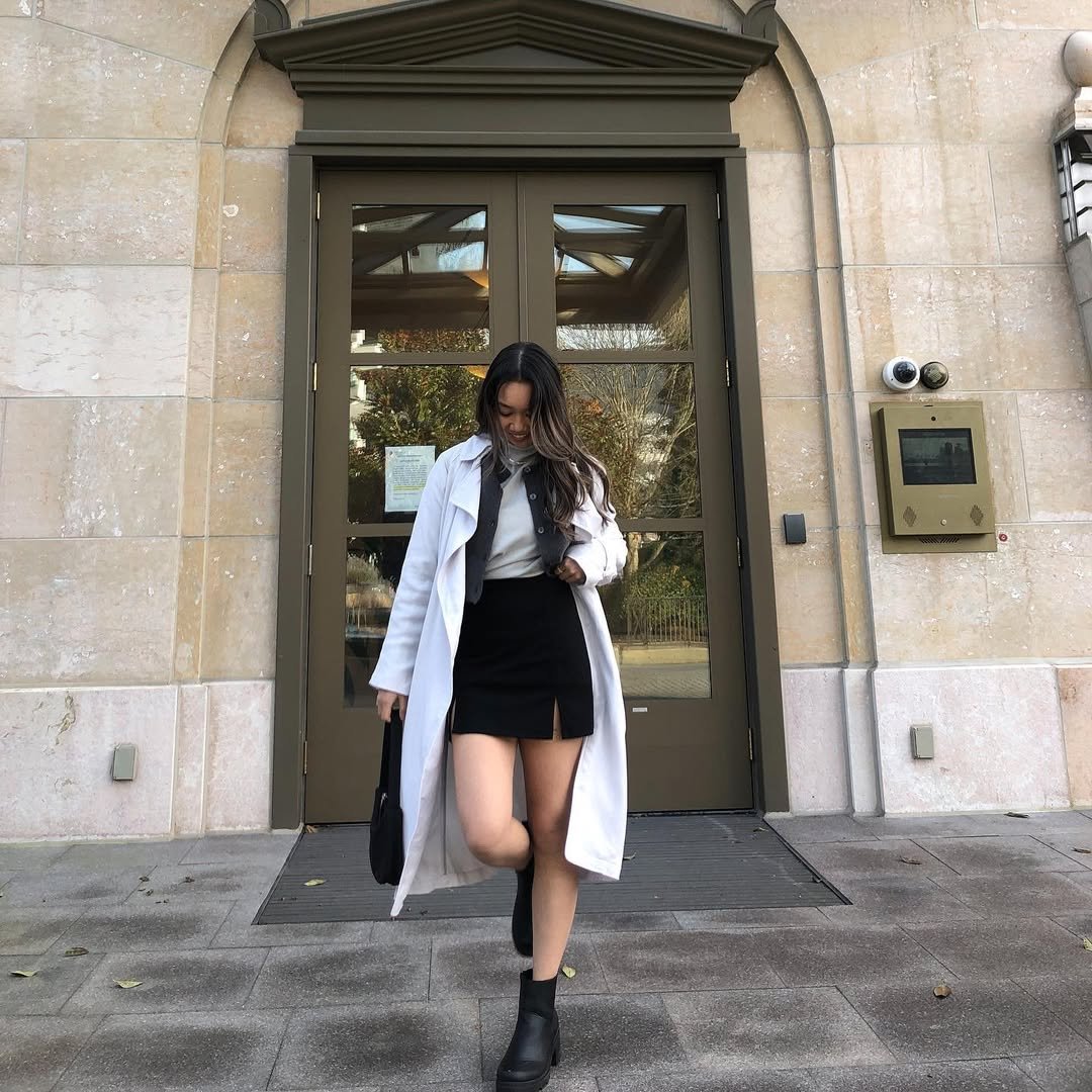 There’s a calm elegance here that feels very put together. The neutral coat layered over a fitted base keeps everything streamlined, while the mini skirt adds just enough edge.
