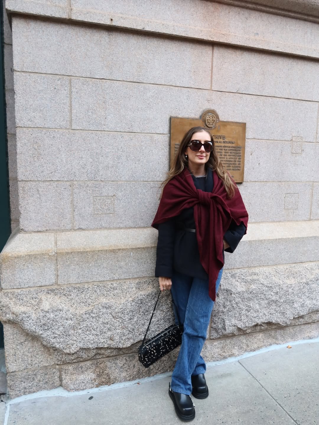 There’s something so classic about this combination. A dark base layered with a rich burgundy wrap draped over the shoulders creates that understated elegance that never feels forced.