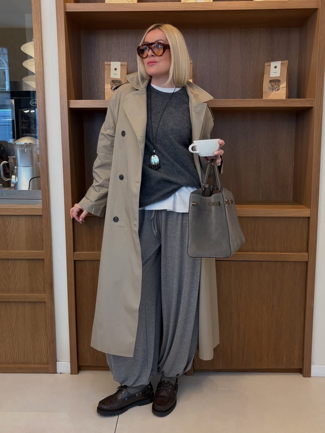 This is that perfect coffee shop outfit where comfort meets intention. A soft grey set layered under a structured trench instantly feels more refined, like you’ve taken loungewear and given it a purpose.