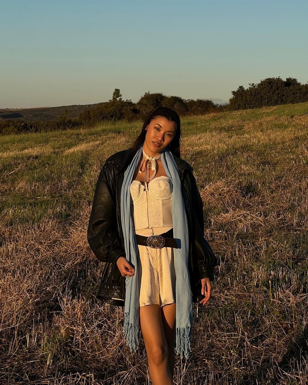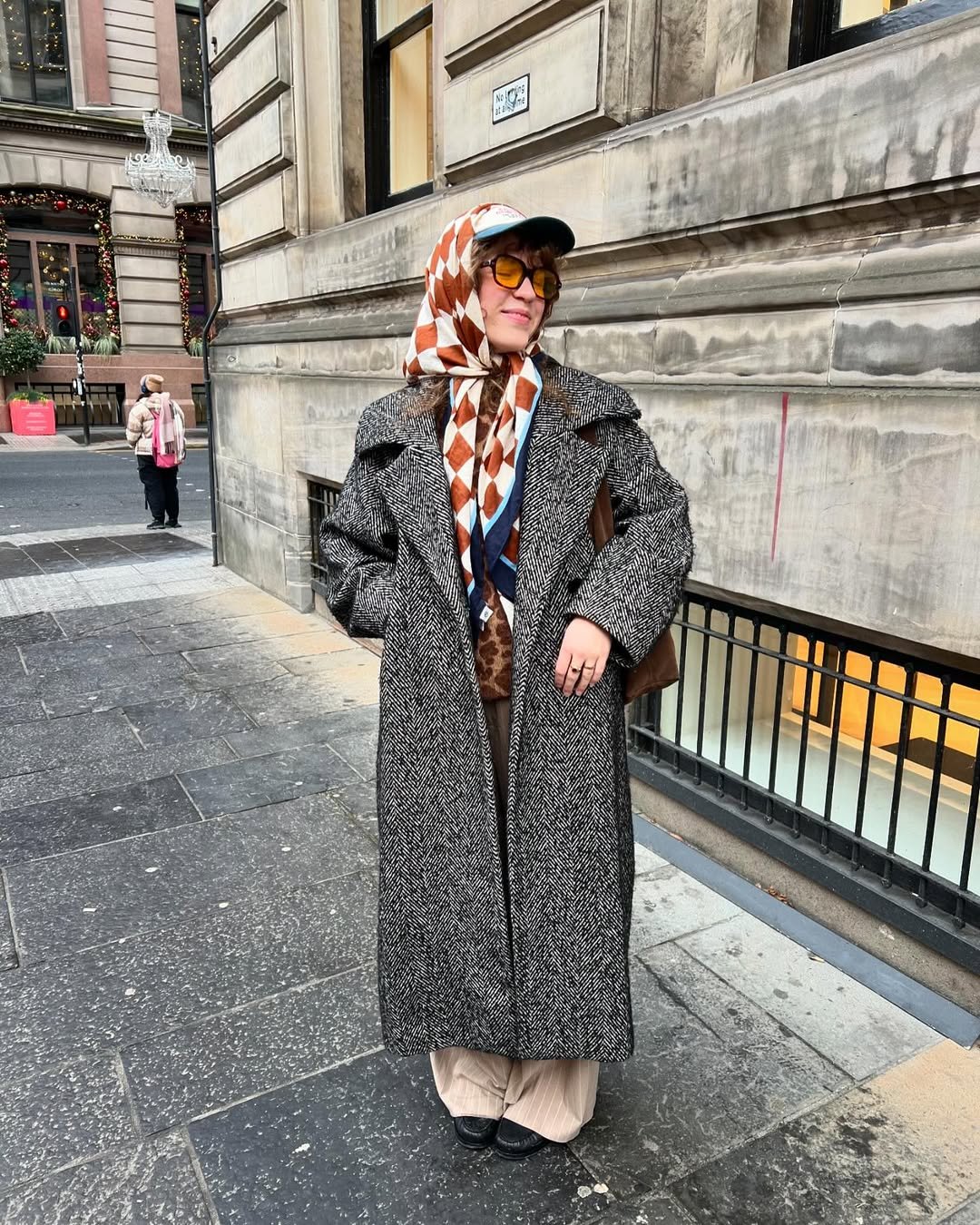 The headscarf adds a soft, almost nostalgic touch. It feels personal, like a look built from pieces you’ve loved for years rather than something styled all at once.