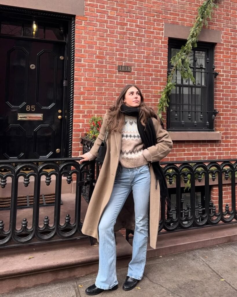 This one feels like a slow Sunday wrapped in layers. A light knit, relaxed denim, and that softly structured jacket create a look that feels lived-in and warm.