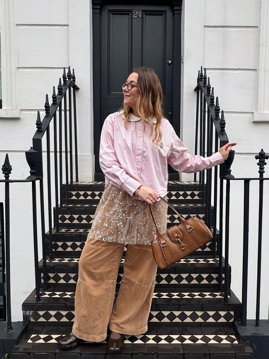 There’s something so charming about this unexpected mix. A crisp striped shirt paired with wide corduroy trousers, finished with that shimmering layer in between, it shouldn’t work, but somehow it really does.