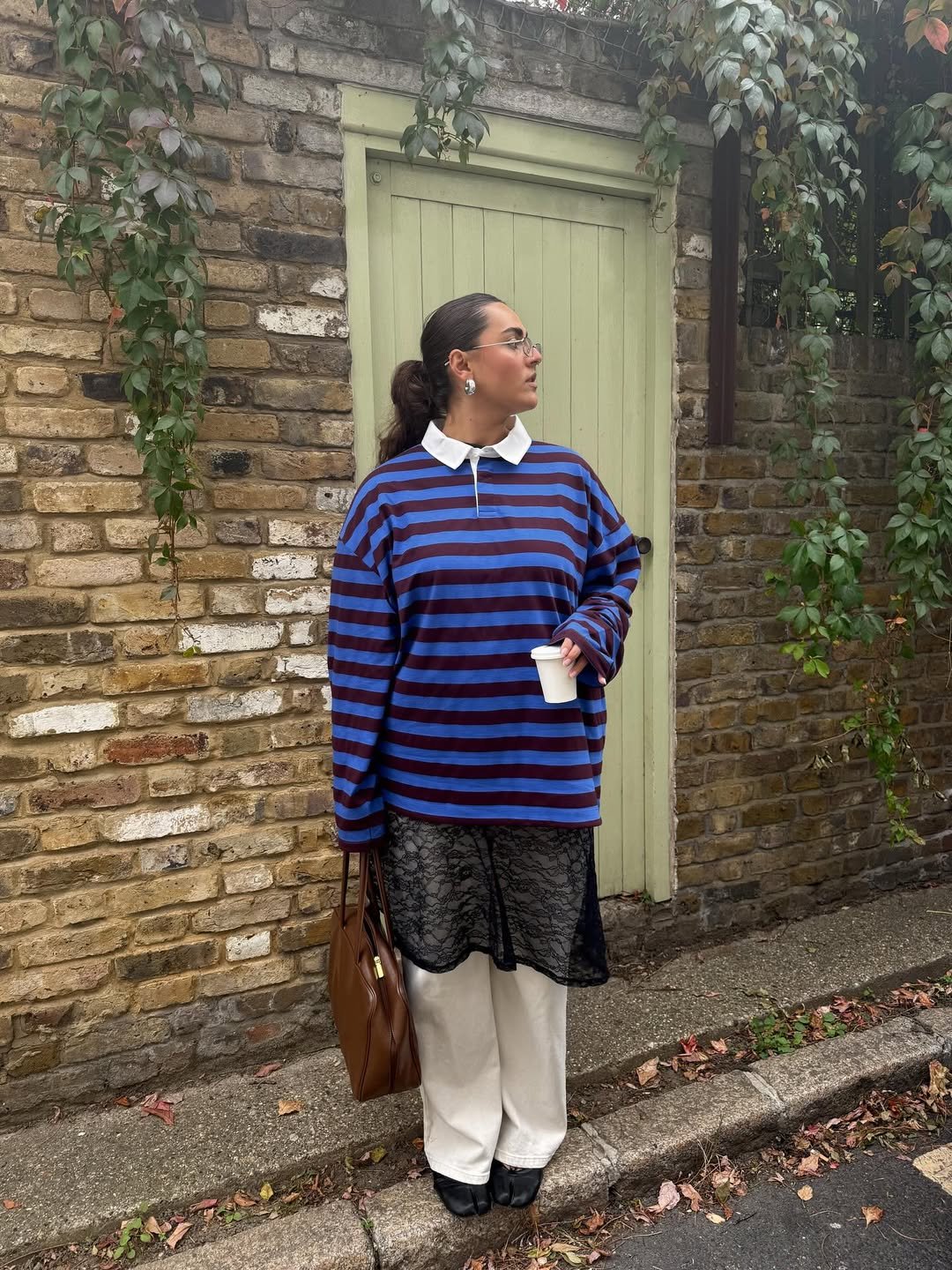 This one feels like a slow morning outside your favorite café. The oversized striped knit brings a laid-back energy, softened by that delicate lace peeking through underneath.