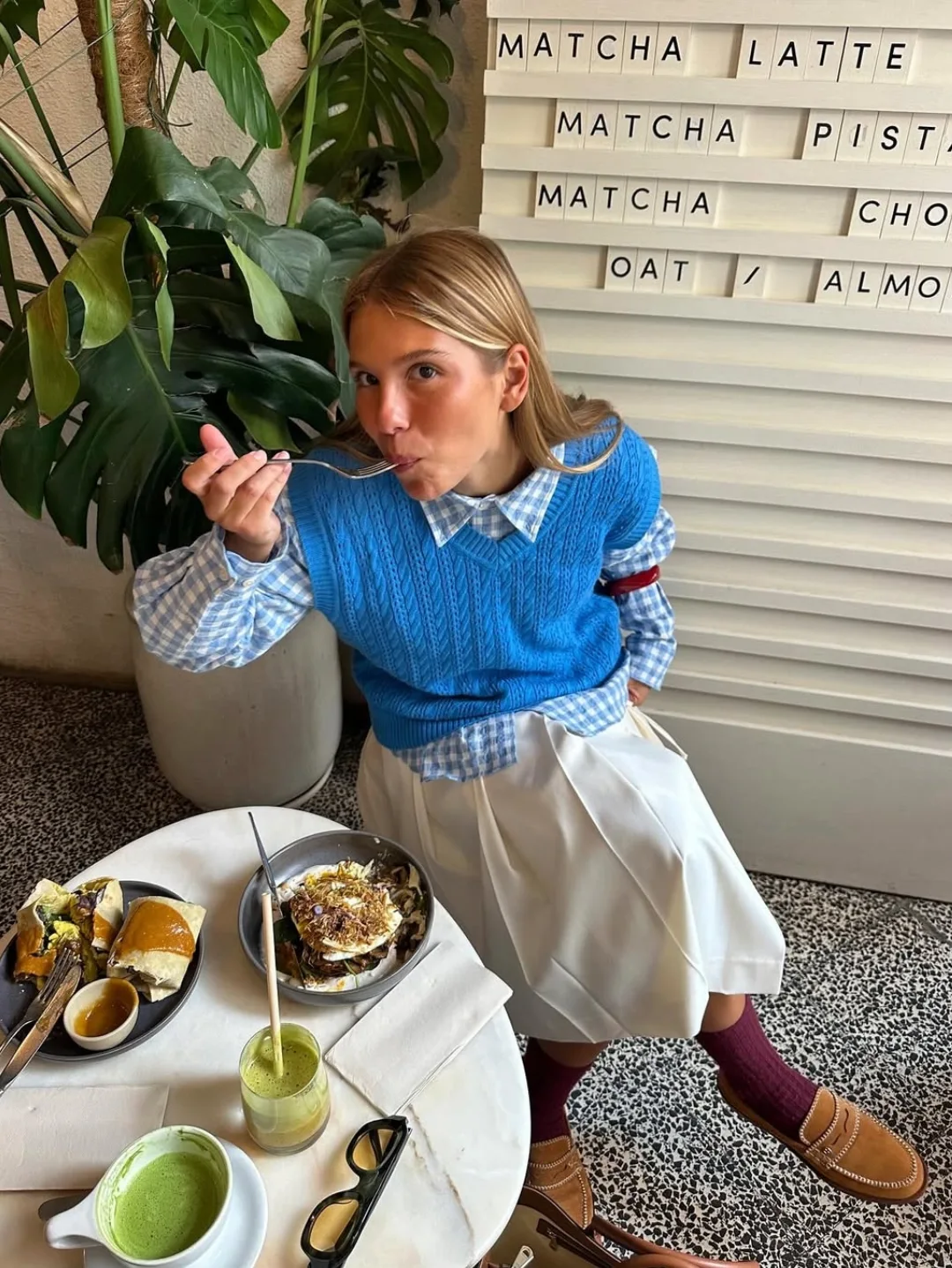 This look feels like a slow brunch with nowhere to rush off to. The layered blue knit over a crisp shirt paired with that soft skirt creates a light, easy silhouette.