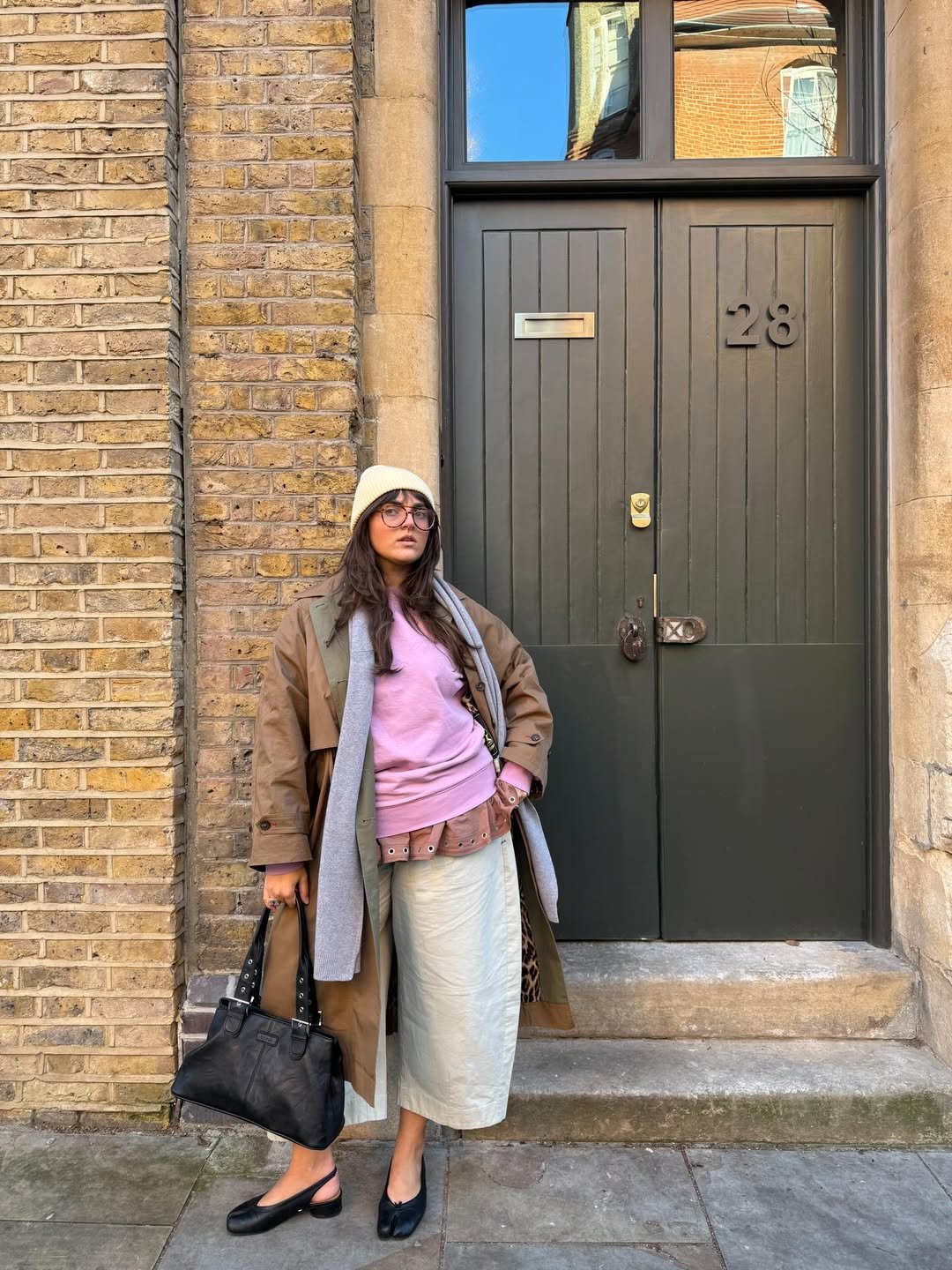 This look feels like a quiet London morning, where everything is a little muted but still thoughtfully put together. The mix of a relaxed trench, soft knit, and that flowy skirt creates a layered story that feels effortless rather than styled.