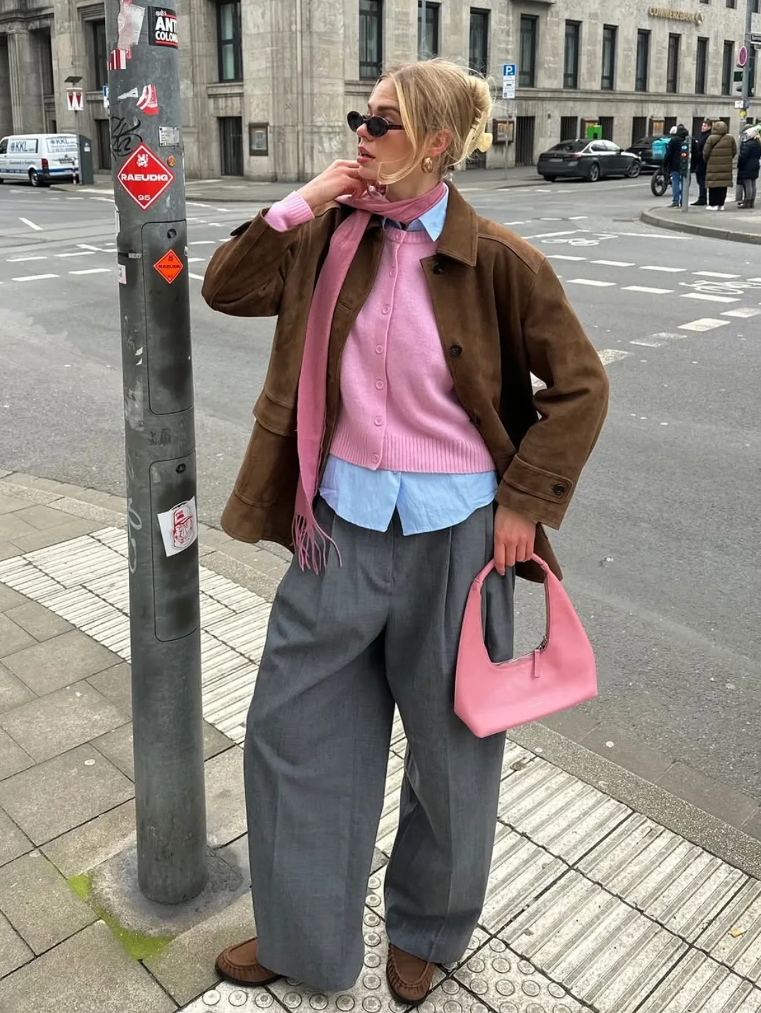 This look feels like a quiet nod to classic dressing, but with a softer, more playful twist. The pink cardigan layered over a crisp blue shirt, finished with that matching scarf, brings a sense of balance that feels thoughtful without trying too hard.