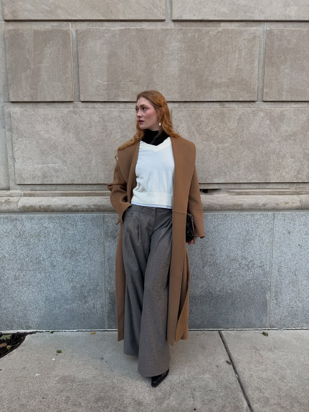 This look leans into structure without losing softness. A sleek turtleneck tucked into wide-leg trousers, finished with a long coat, creates clean lines that feel quietly confident.