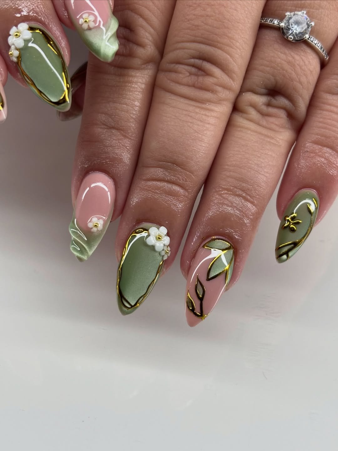 Olive green meets blush nude with raised gold accents and sculpted floral details. The metallic outlines trace each shape, almost like jewelry framing the nails.