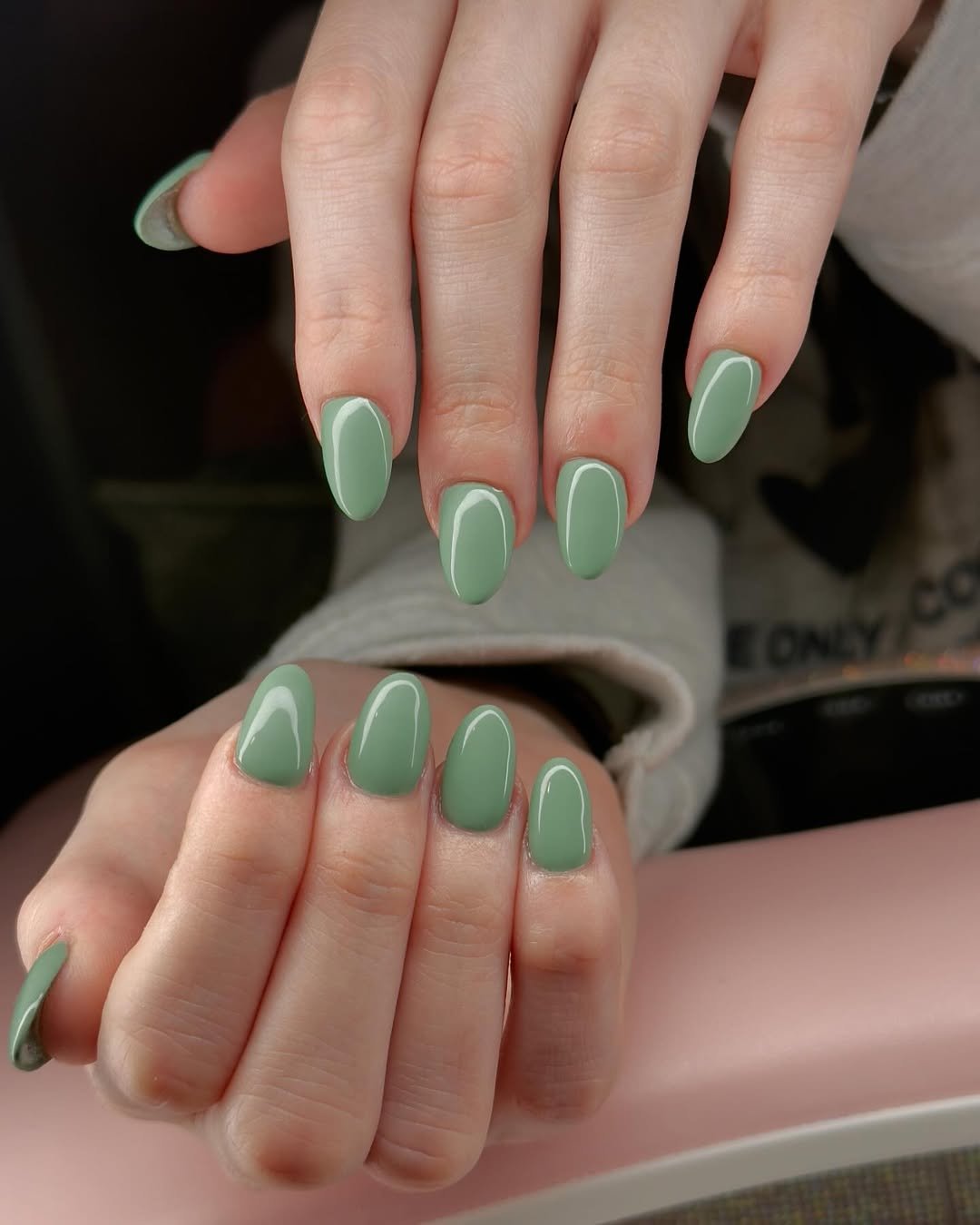 There is something about a creamy sage that feels like fresh linen in a sunlit room. These glossy almond nails strike that balance between earthy and polished, with a soft green tone that flatters without shouting for attention. The shape elongates the fingers, while the muted hue keeps everything feeling refined.
