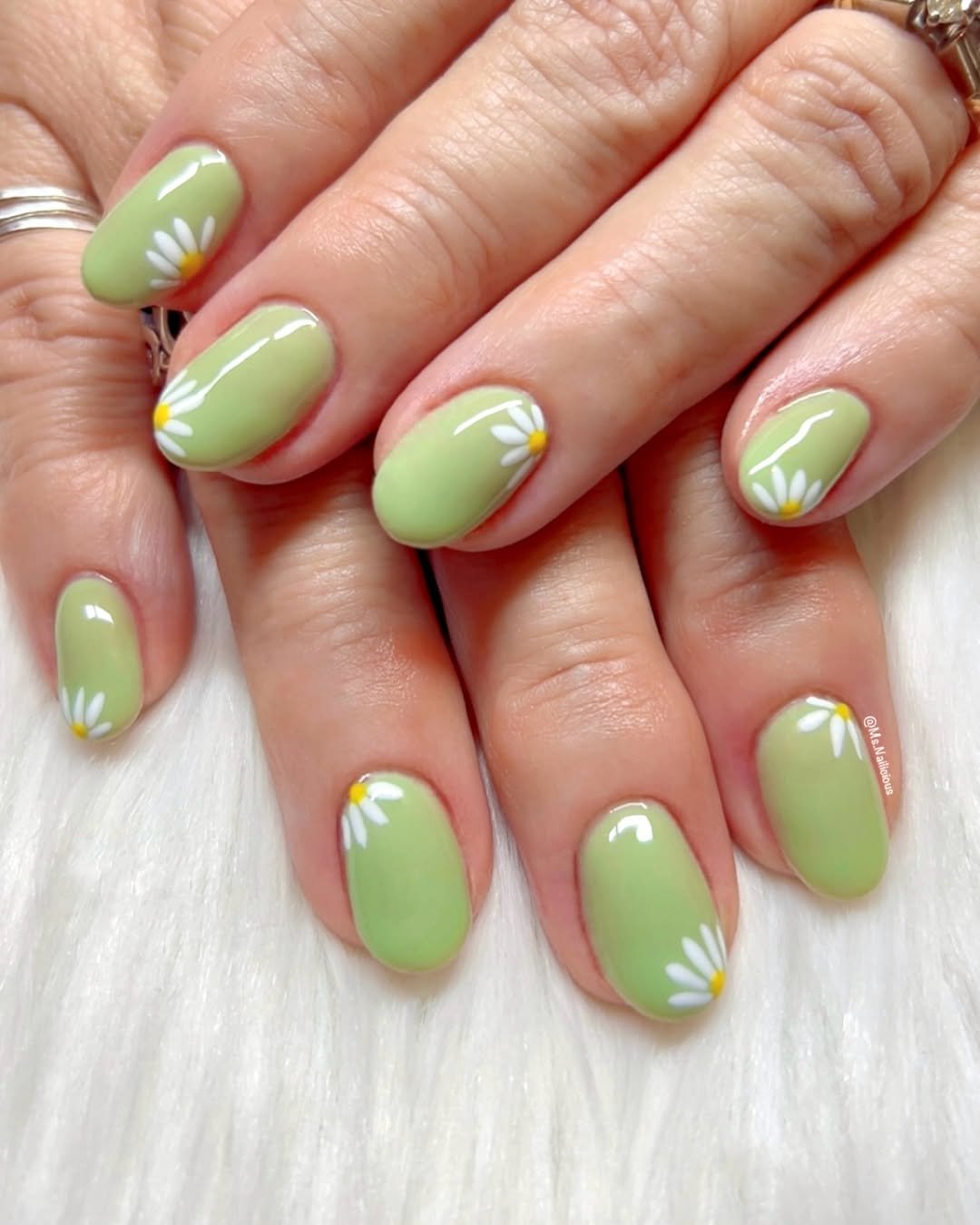 Soft pistachio green paired with tiny white daisies feels like spring bottled up in a manicure. The rounded shape keeps it sweet and wearable, while the glossy finish adds that clean, just-stepped-out-of-the-salon glow.