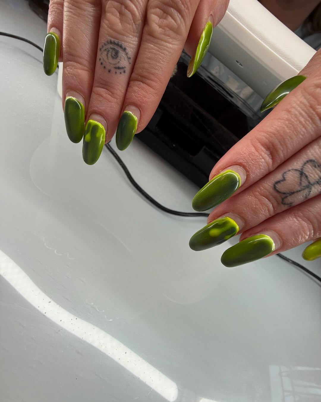 This feels like the manicure you book before a weekend away. Airy dresses, slick buns, oversized sunnies. The mix of solid green and fluid lines keeps it interesting without overwhelming the look.
