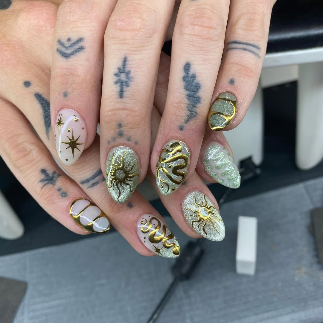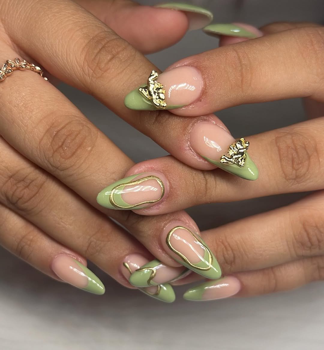 Sage green tips outlined in gold create a sculpted, almost architectural look. Add in textured metallic accents, and suddenly the manicure feels like wearable art.