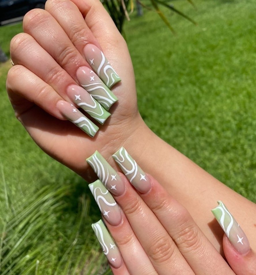 Long square tips in muted sage paired with crisp white abstract lines and tiny star accents give this set a modern edge. The negative space keeps it fresh, while the bold shape makes it feel confident.