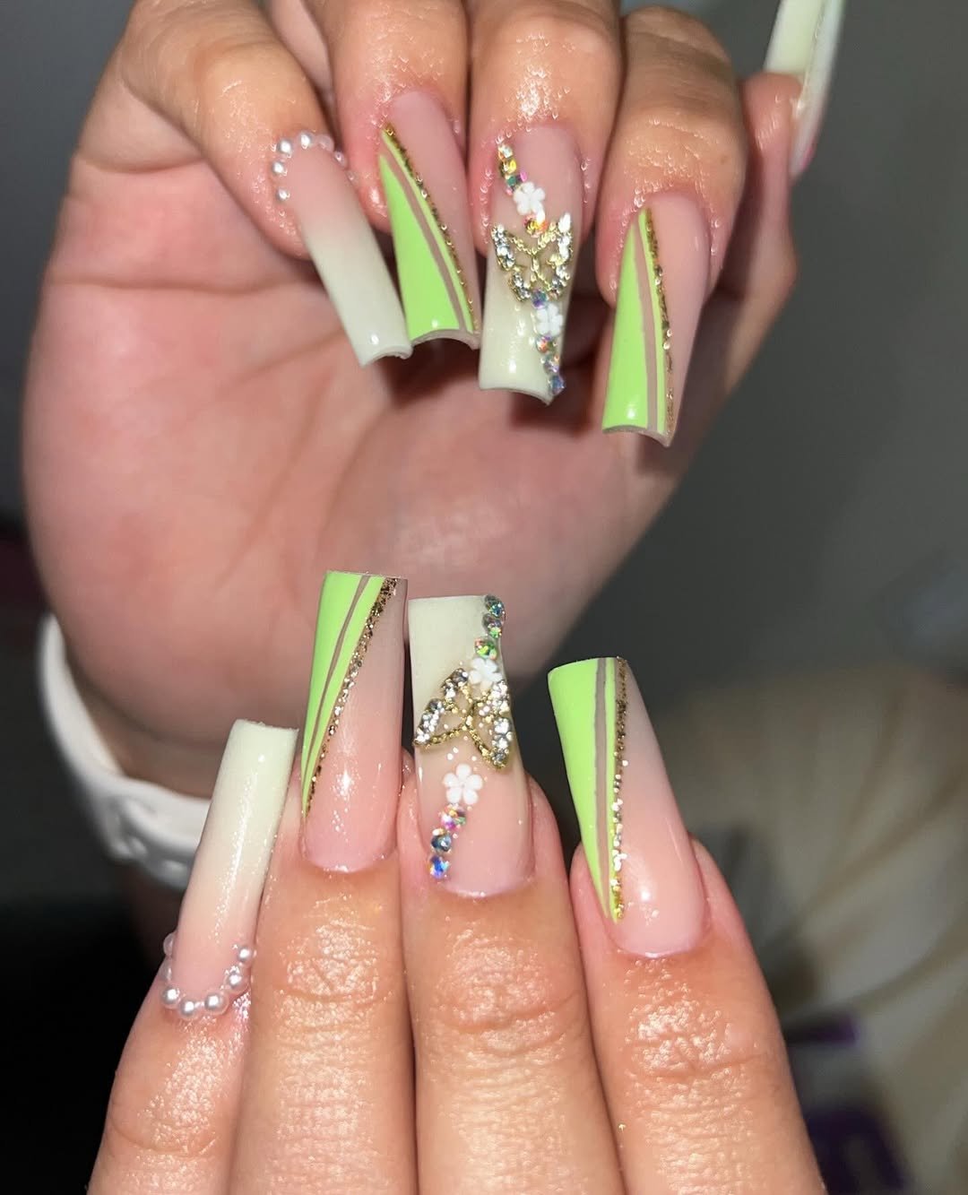 Long square tips meet vibrant lime panels, crystals, and fine gold striping. This set leans glam, with a playful contrast between sheer base and neon accents.