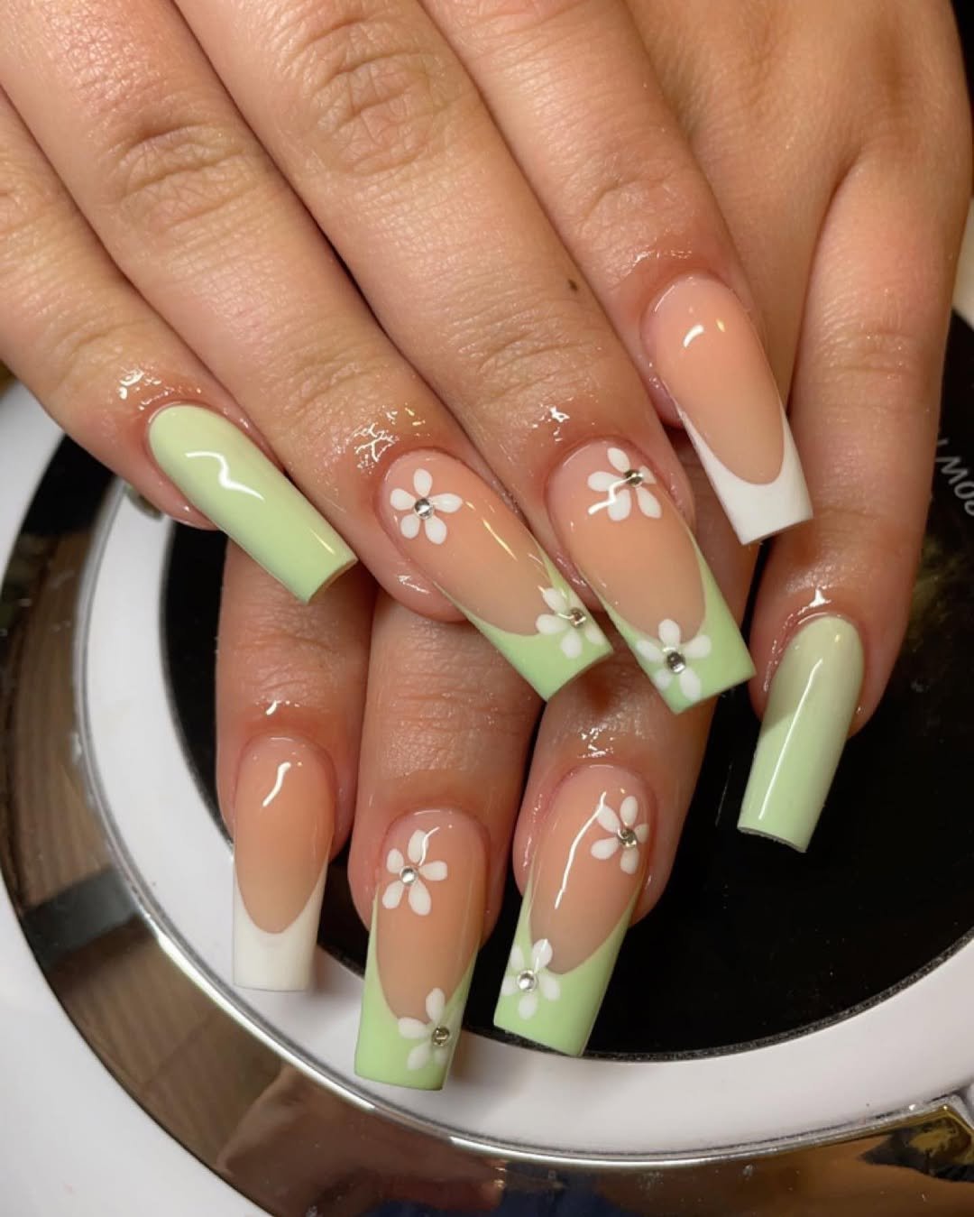 Long square tips with soft mint panels and delicate white flowers create a romantic, almost bridal vibe. The subtle rhinestone centers add just enough sparkle without overwhelming the design.