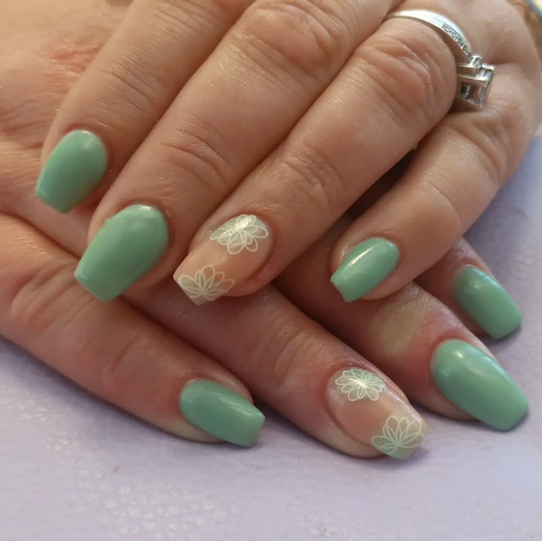 Muted mint paired with a sheer accent nail and delicate white floral outlines feels timeless. The rounded shape and glossy finish keep everything clean and wearable.