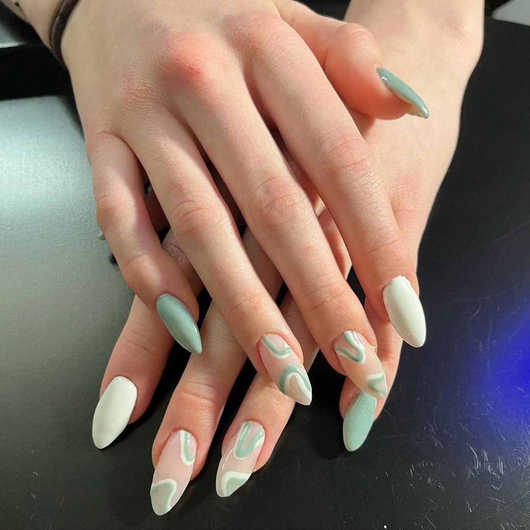 Soft mint and creamy white melt together in the dreamiest abstract swirls. The negative space keeps everything feeling light, while the pointed almond shape adds a subtle edge. It is modern, but not loud. Artistic, but still wearable.