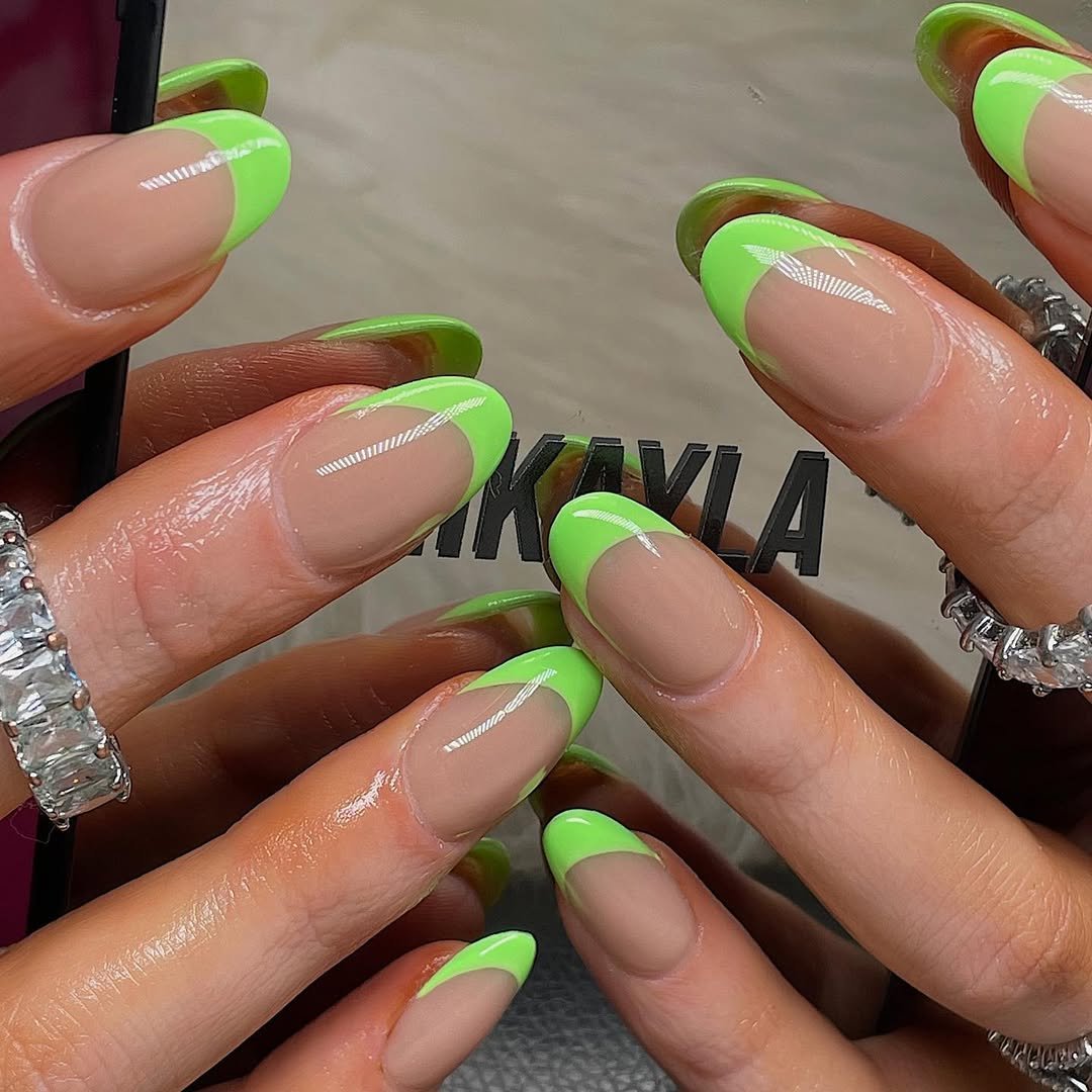 A classic nude base meets electric lime tips, and suddenly French manicures feel playful again. The sharp almond shape gives it that confident edge, while the highlighter green adds a bold, fashion-forward twist.