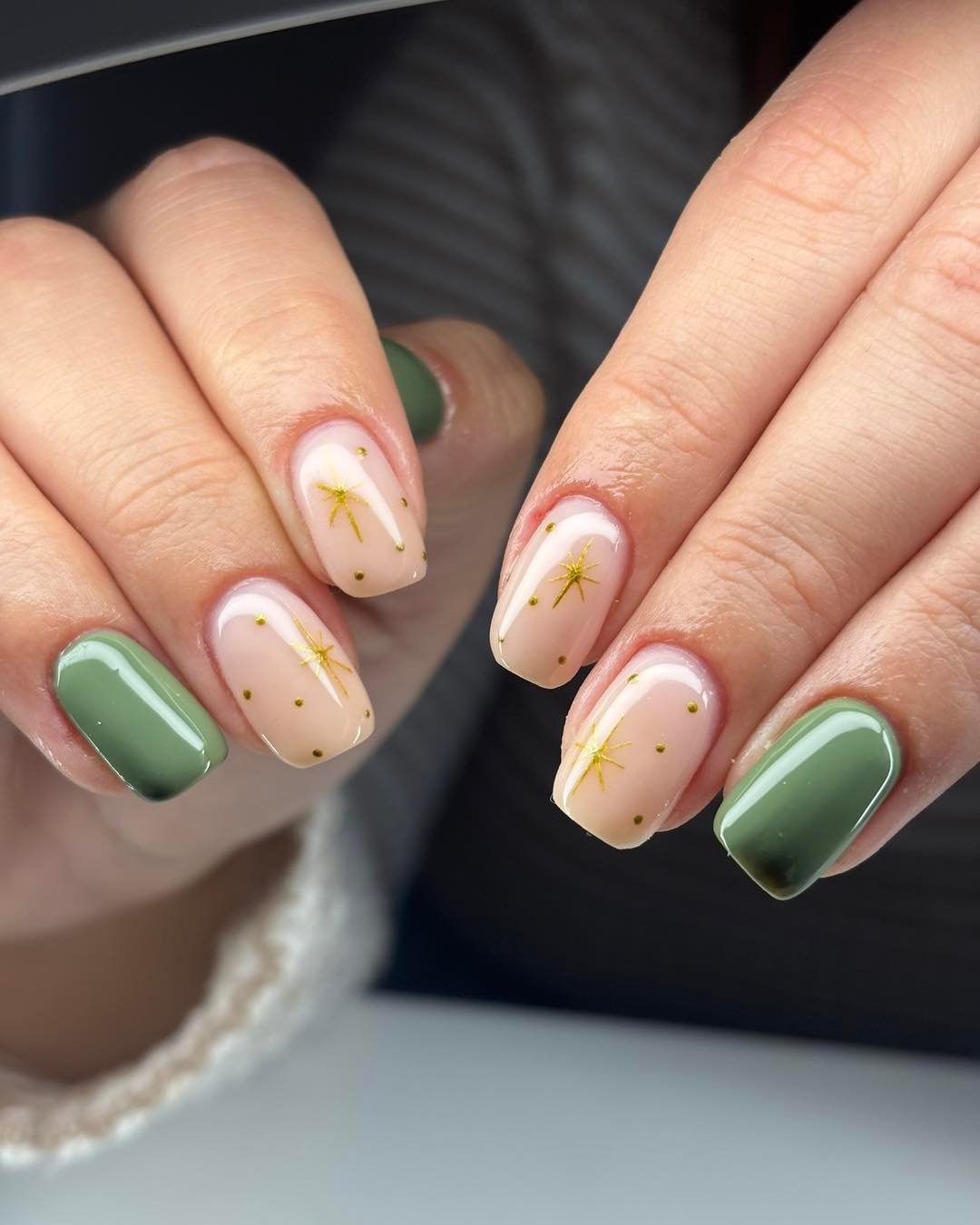 Muted olive paired with sheer nude and tiny gold starbursts feels almost celestial. The contrast between glossy green and delicate detailing creates that elevated balance we always chase. It is festive, but refined.