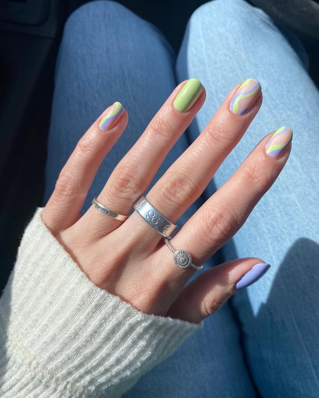 Soft lime and lavender swirl together over a sheer nude base, creating that carefree, windows-down kind of energy. One nail stays solid green, another lilac, while the rest dance with wavy pastel lines that feel playful without being chaotic.