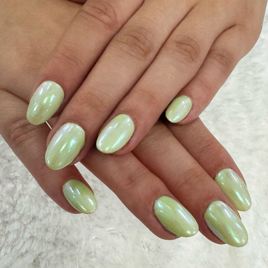 A soft pistachio base kissed with a pearly sheen gives these nails an almost glazed finish. The light reflects gently, creating that subtle shimmer that feels elegant rather than flashy.