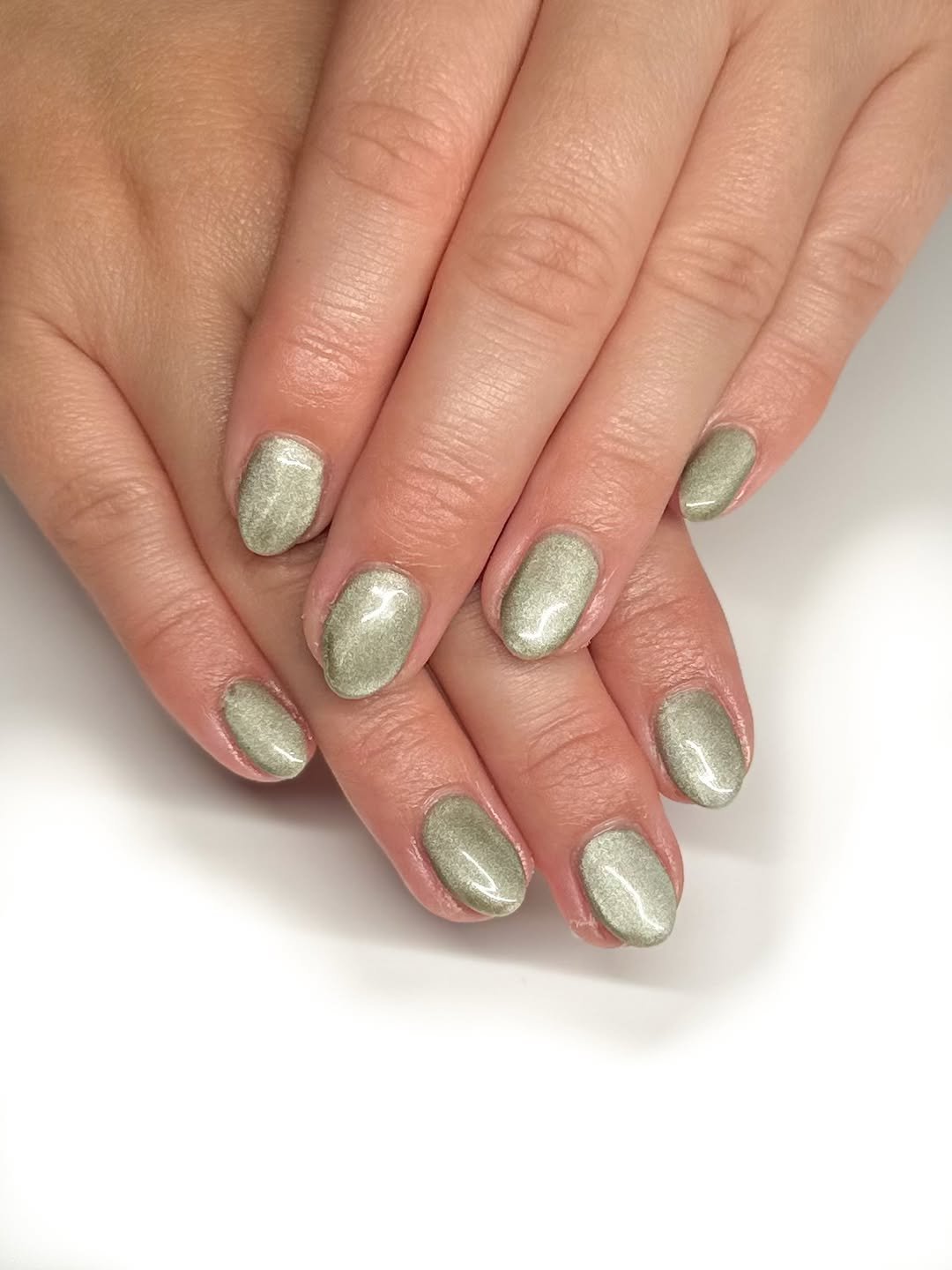 A metallic sage polish with a pearly sheen transforms a simple short manicure into something quietly luxe. The subtle shimmer catches the light in the most flattering way, giving depth without glitter.