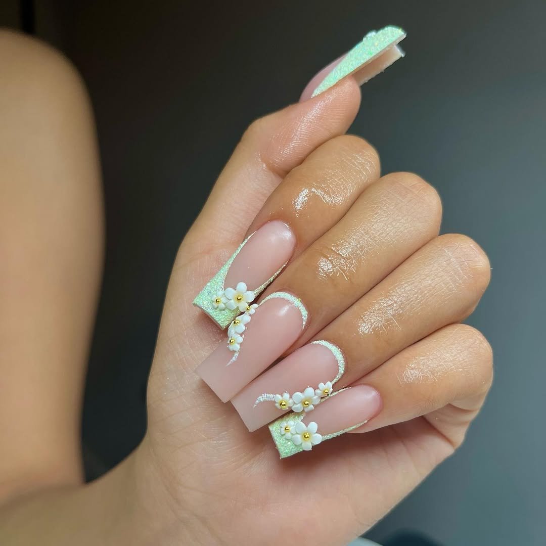 Matte blush and mint combine with textured floral appliqués for a look that feels delicate yet bold. The squared shape gives structure, while the soft color palette keeps it romantic.